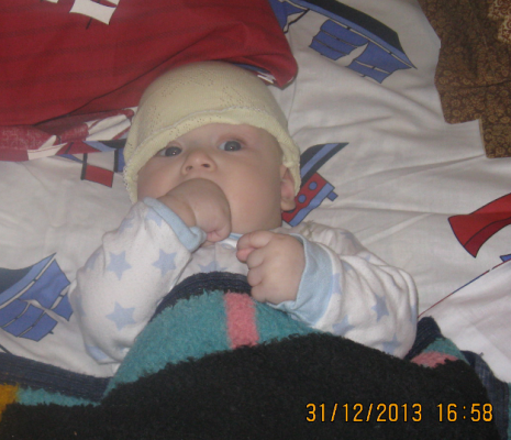 "Хомяк разумный" - освоил перевороты со спины на живот, на бок, но с живота на спину - никак. Лежа на пузе тягает игрухи, дегустирует их. Если устает - лежит раскинув ручки и жалобно пищит "меме-меме"(возможно это он так маму зовет, а может это значит "ну переверните меня хоть кто-нибудь!!!"). Лежа на спине любит во время переодевания утащить у мамы памперс, салфетку, одежку, крем и все это тут же в рот - отбираешь, а он лыбится и хохочет. А еще любит свои ноги, но все время делает большие удивленные глаза