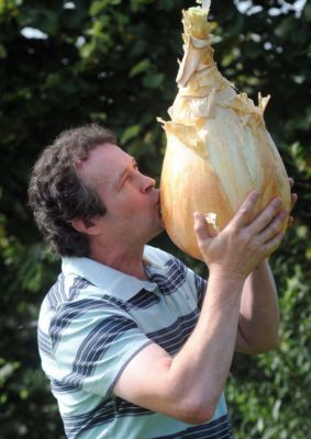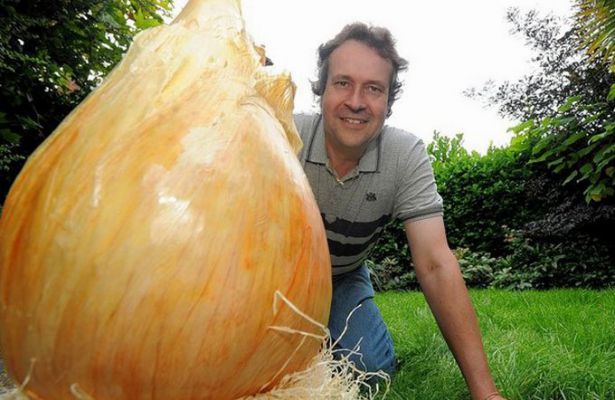 Tony Glover (Великобритания) смог вырастить гигантский лук, весом в 8,5 кг. Это стало поводом для новой строки в Кинге рекордов Гиннеса. Предыдущий рекордсмен был весом 8,2 кг. Очистить такой лук и порезать, наверное стоит много слез.
