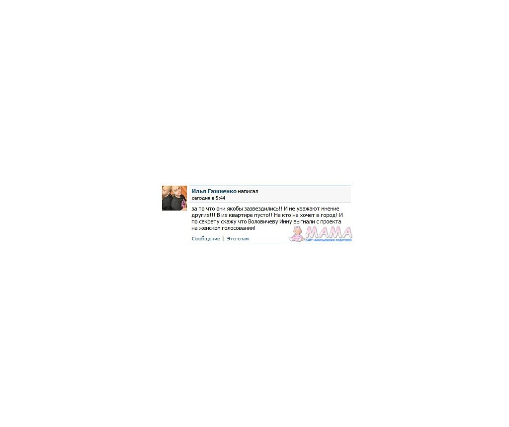 Еще слухи. Глеб замутил с Элей. Инку выгнали. Лично я не верю про Инну. Это Гажиенко трепит. Его спросили че Трулька и Саня на поляну сосланы.