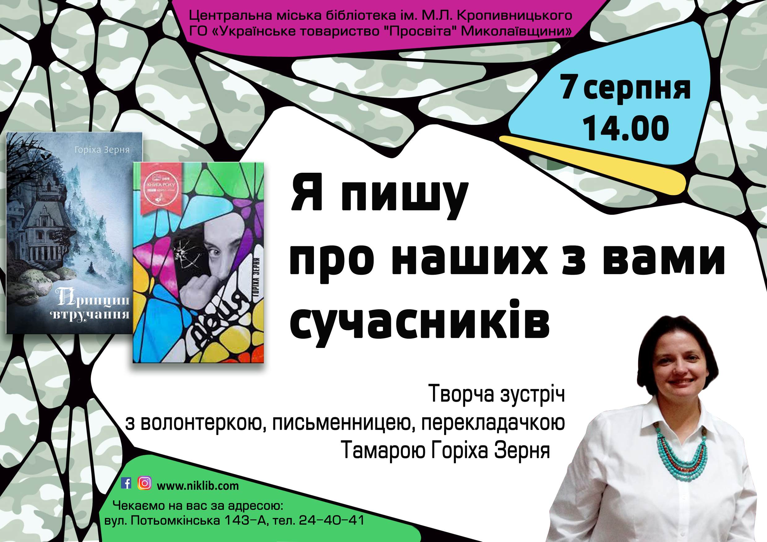 в эту субботу, 7 августа, в библиотеке им.Кропивницкого состоится встреча с автором, Тамарой Гориха Зерня. Начало в 14:00.