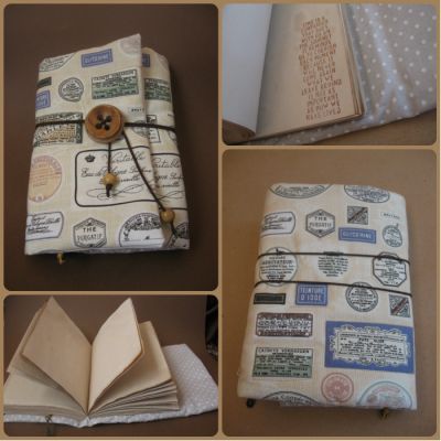 Формат А6.120 листов тонированных кофе и корицей,частично проштампованные.Обложка-2 вида хлопка и синтепон.Закрывается на пуговицу с резинкой.Книжный переплет..Закладка вощеный шнур с шармиком.