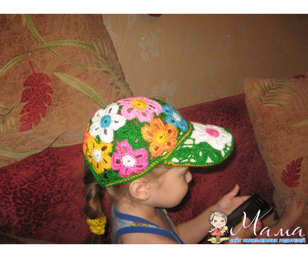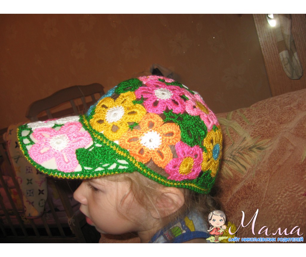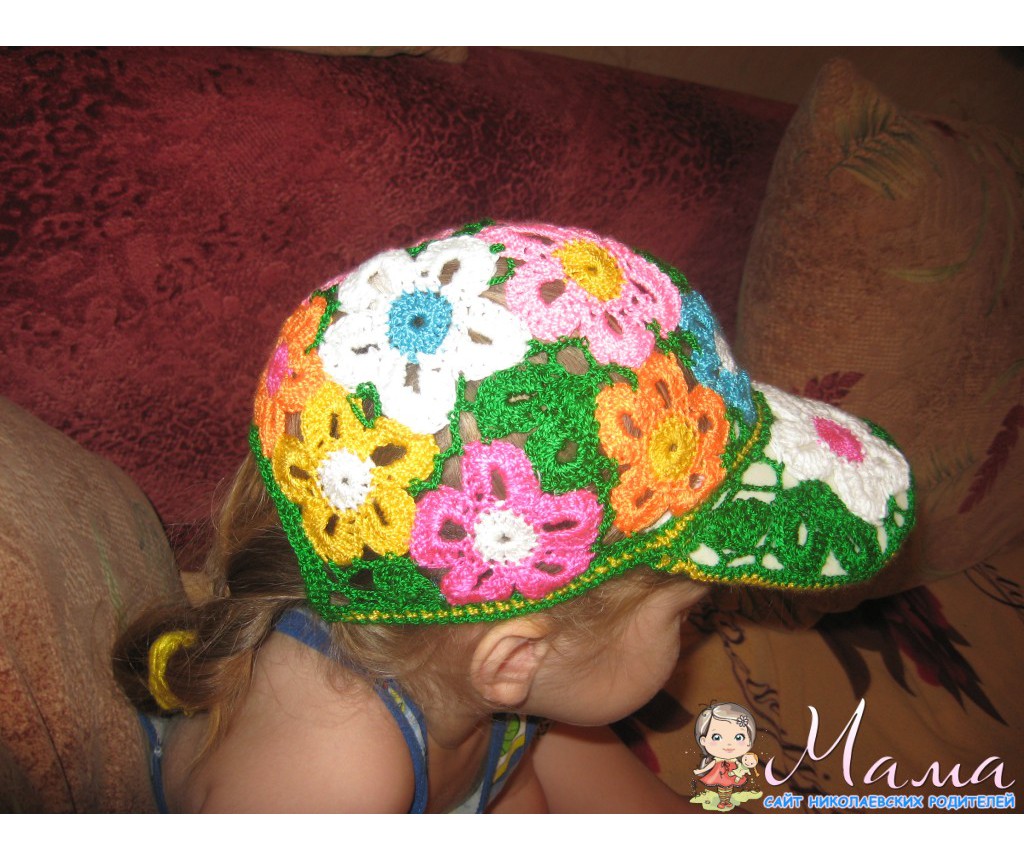 Круто) Обвязали каркас от старой кепки? Не совсем понимаю, как вы это сделали. Цветочки отдельно вязали, а потом сшили все вместе?