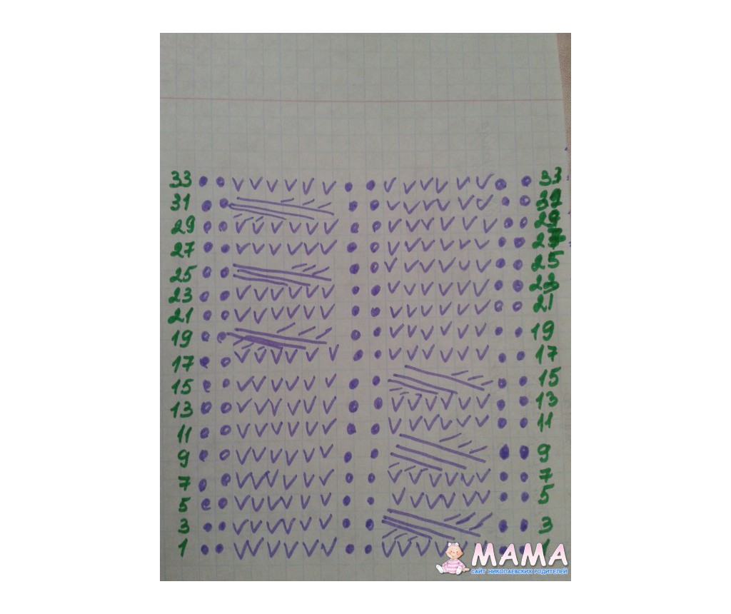 Цитата: #1767 НаташаК 23 January 2013, 16:12Вот схемка, точки - изнаночные петли, галочки - лицевые, перекрёстки - 3 петли снять на дополнительную спицу и расположить перед работой, затем провязать 3 лицевые с основного полотна, потом три петли с дополнительной спицы лицевыми. Число петель при наборе должно быть кратно 8-ми + 2 и +2 кромочные. В схеме приведены нечётные ряды, чётные вязать по рисунку.