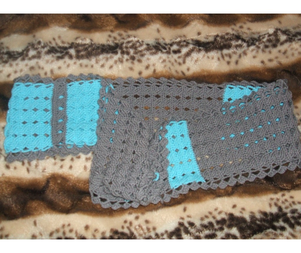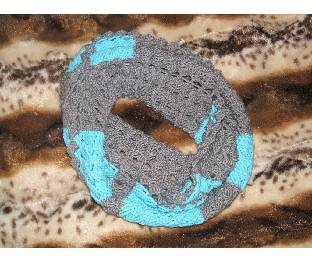 Шарф связан крючком, соединен петлей Мебиуса, что позволяет ему красиво драпироваться.