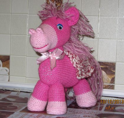 Мама Алісі зв'язала нового друга. Дякую Артеміді за схему, три роки тому ще не було її в вільному доступі в інеті. Я тоді взялася в'язати, але зрозуміло, що це не моє. А нещодавно знайшла і віддала мамі, а вона зв'язала. Донька другий день з рук її не випускає :) Хоч барашка і велика за розміром, але дуже легка, майже невагома.