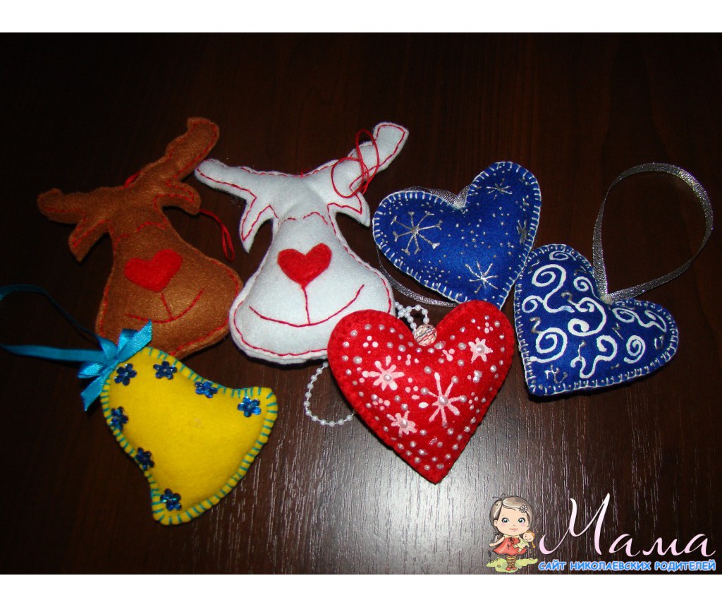 А вот мои последние в этом году игрушки из фетра: олени, прошлых уже раздарила, сердечки, колокольчик и php слоник для мужа (кто в теме, тот поймет