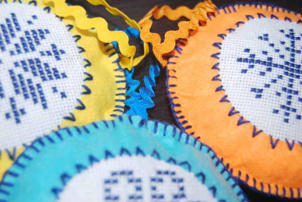 Простыми нитками не так красиво получиться - мулине красиво переливаются. можно попробовать еще нитками для вязания, чтоб толстинькие были. У меня есть разные цвета - белый, голубой, Синий - хочешь я тебе поотрезаю кусочки, если ты елочки делаешь, там не много надо)
