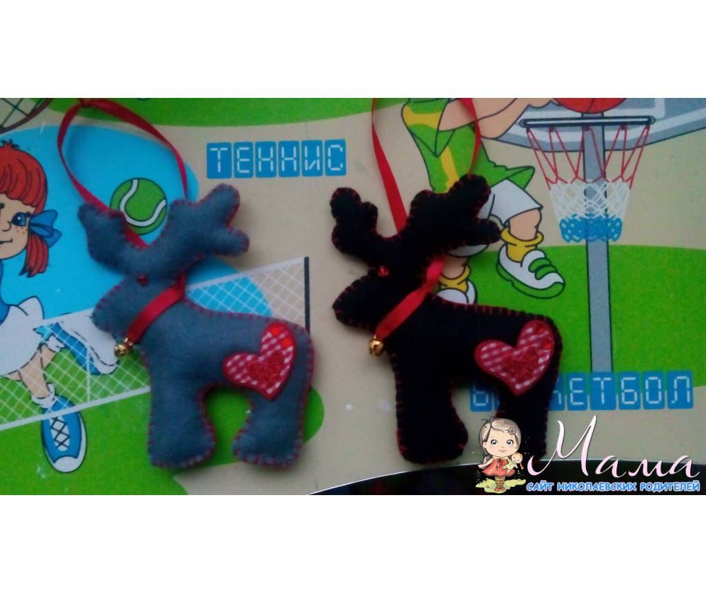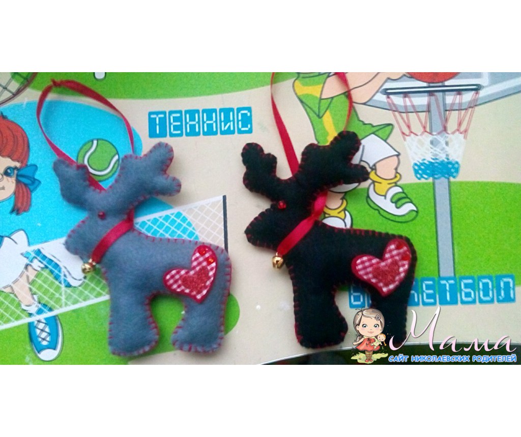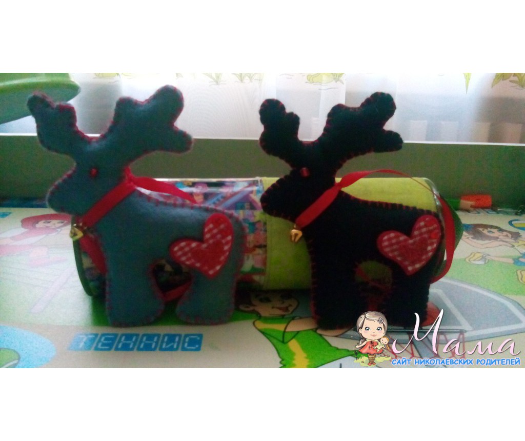 А оленей я тоже очень люблю,они мои фавориты. Купила черного и серого фетра,лежит. Думаю,надо его применить. И так появились они,сердечки на попки покупала готовые.