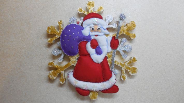 Снежинка из пенопласта) Покупала её в Хоббимаркете на Комсомольской - смазала клеем ПВА и посыпала блёстками, а затем с помощью клеевого пистолета зафиксировала на ней Дедушку Мороза.