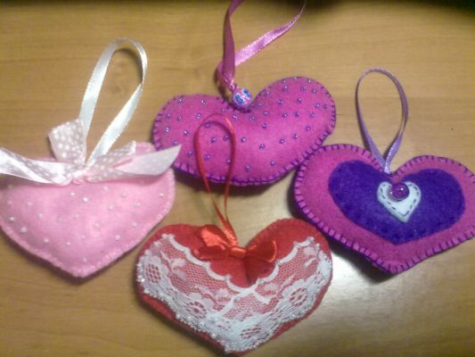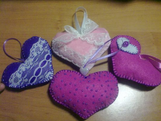 Интересно было поработать с таким материалом как фетр. Вот такие"валентинки" получились у меня)