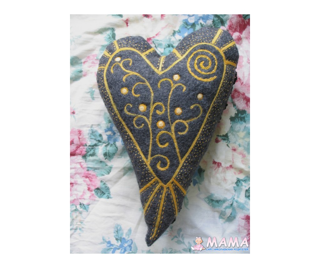 та нет ))) это не к февралю подготовка, а производственная необходимость была ))) сначала валяла булыжник на шаблоне, но получилось плохо - форма неудачная, совсем не каменная. провалялся он у меня с полгода, если не больше, недавно посмотрела на него, разрезала и сшила сердечко ))) ничего другого в голову не пришло )) рисунок приваляла и карман вязаный пришила. мне оно немного готичным кажется
