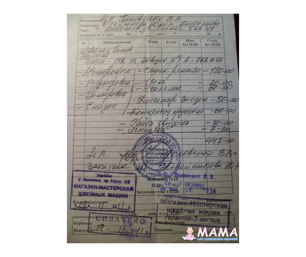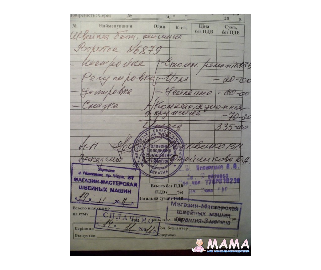 Да, ремонтировала я как то у Сергея, работают они на рынке  "Колос", цены у них космические. Чтоб все девочки знали, не советую я к ним обращаться, т.к. профилактика одной и ремонт второй мне обошлись в 447 грн. и второй в 335 грн. По ихнему прейскуранту стоимость ремонта 180 грн. любой машины. Я глупая от незнания так попала, сама виновата. Еще и дешевую органовскую иглу впарил за 20 грн. за 1 ШТ..... и не кривятся же! Я просто не знала сколько мастера берут вот столько заплатила (деньги были )). С меня потом мастер другой смеялся, говорит ты не первая, мне потом рассказали что все стоит намного дешевле!!!. Хотя у кого деньги есть, то почему бы и нет .