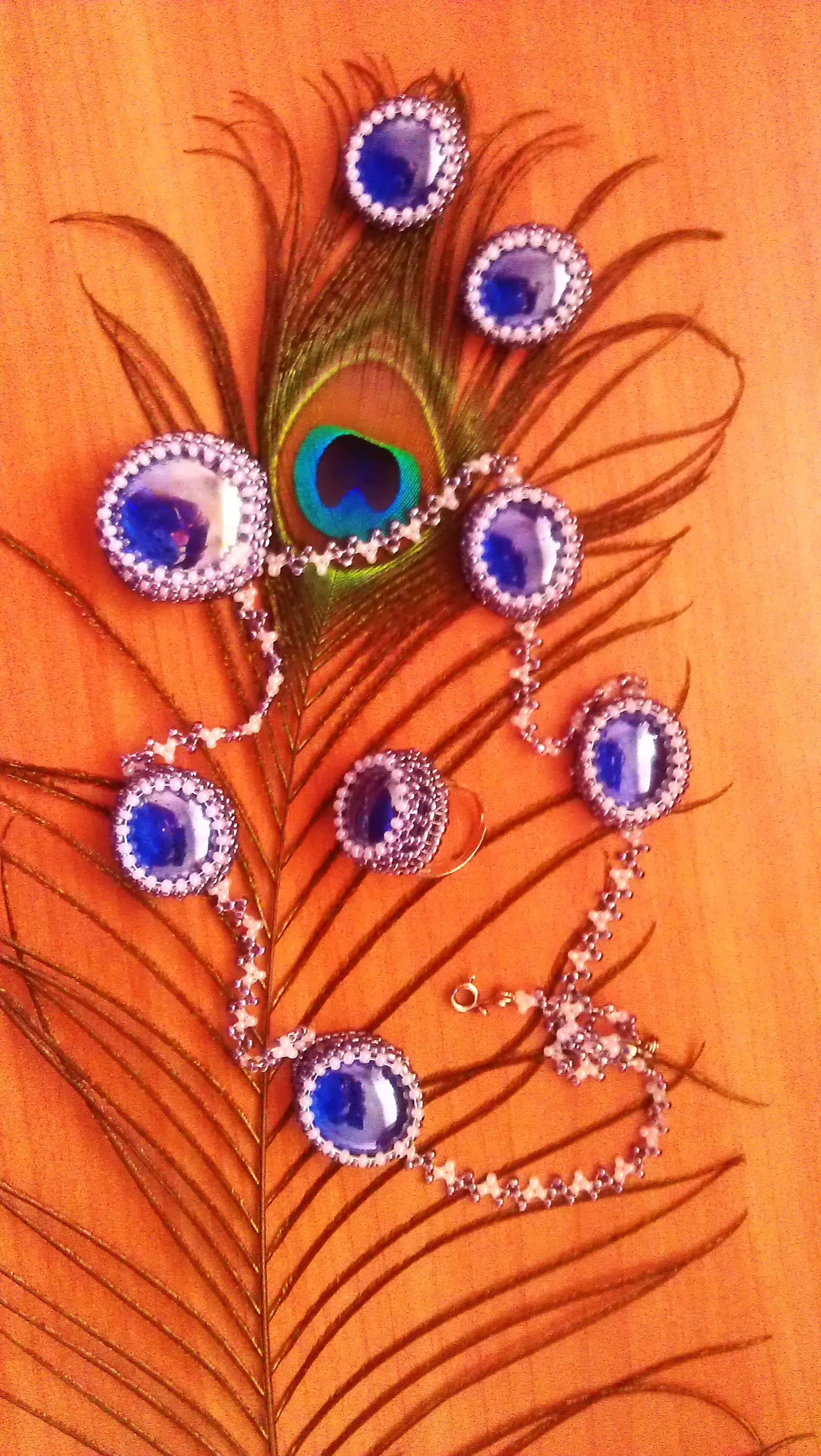 , а это кольцо, клипсы и колье. Хотела делать на заказ, но все знакомые не знают куда это носить, говорят: "Да, красиво, но это же бисер, а не драгоценные камни и металкласс! я смотрю Вы с бисером больше работаете, да? а я его не очень люблю, потому что он мелкий, неудобно мне, но зато какие шедевры из него получаются!