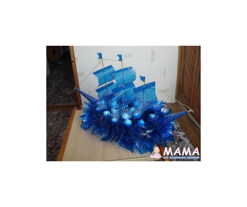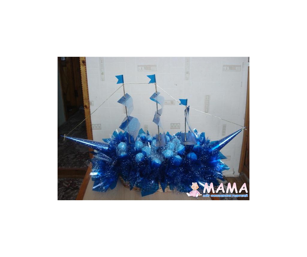 Гитара - просто потрясающе красиво и оригинально, букет и корзинки - очень нежные. А в кораблике не пойму - во ччто конфетки завернуты - так интересно смотрится