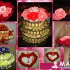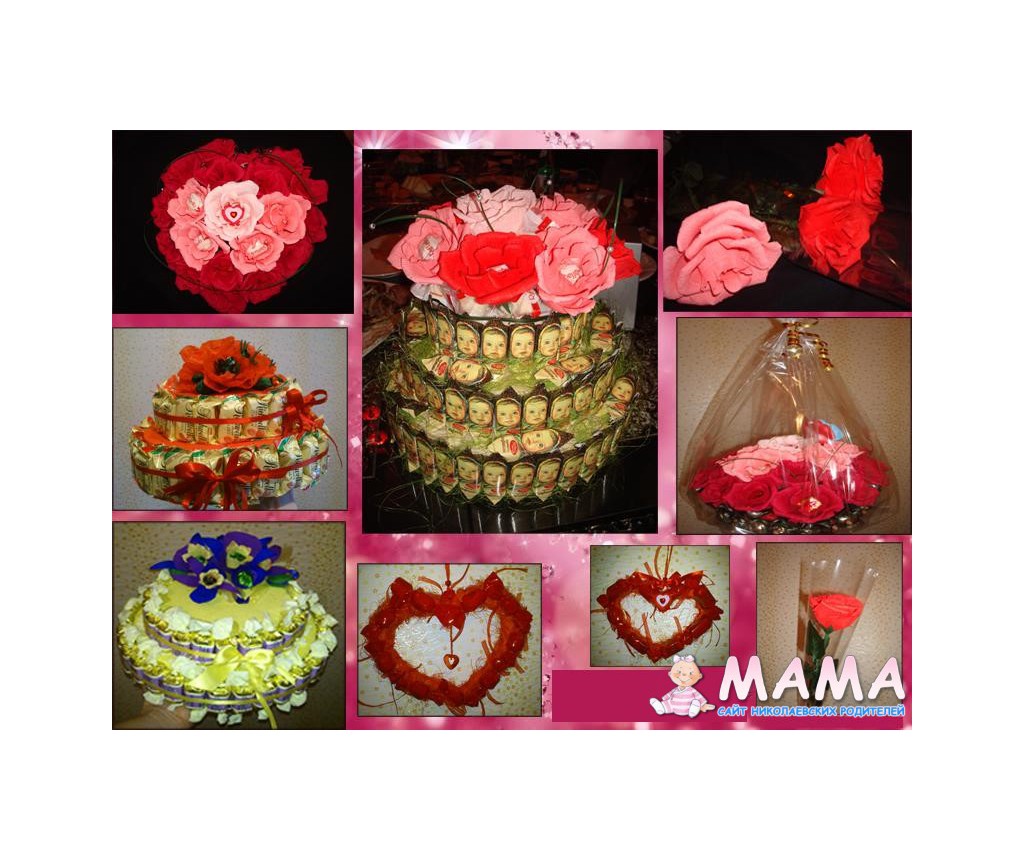 Танюш. я не профессионал я пока еще учусь. Когда я делала гитару то делала основу из картона и сверху обклеивала конфетами; машина там основа картон+пенопласт, сверху конфеты, но капот открывается внутри или конфеты или маленькая бутылочка коньяка; в букетах верхние хвостики конфет я не заклеивала, и если раздвинуть лепесточки, то конфетка легко извлекается из обвертки,