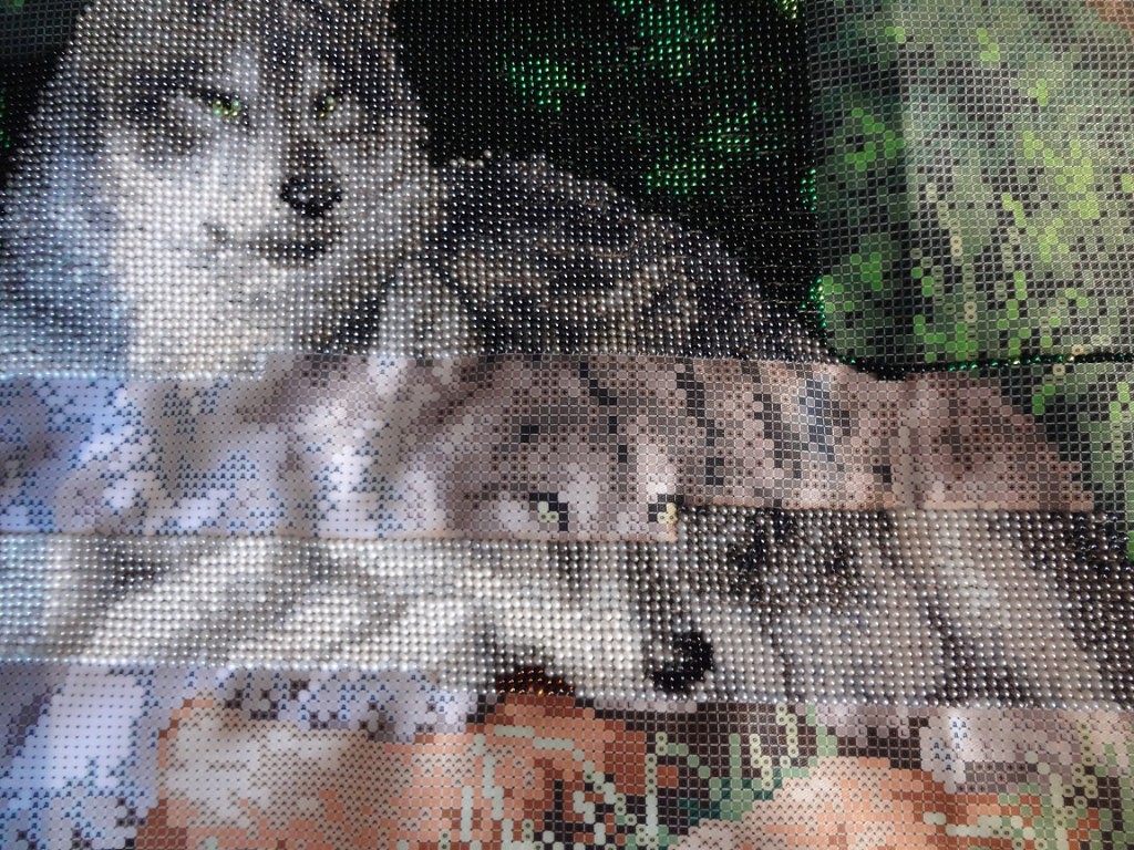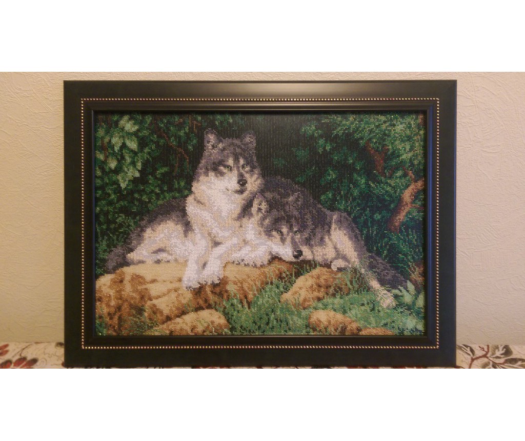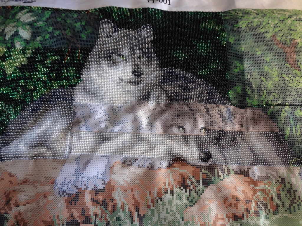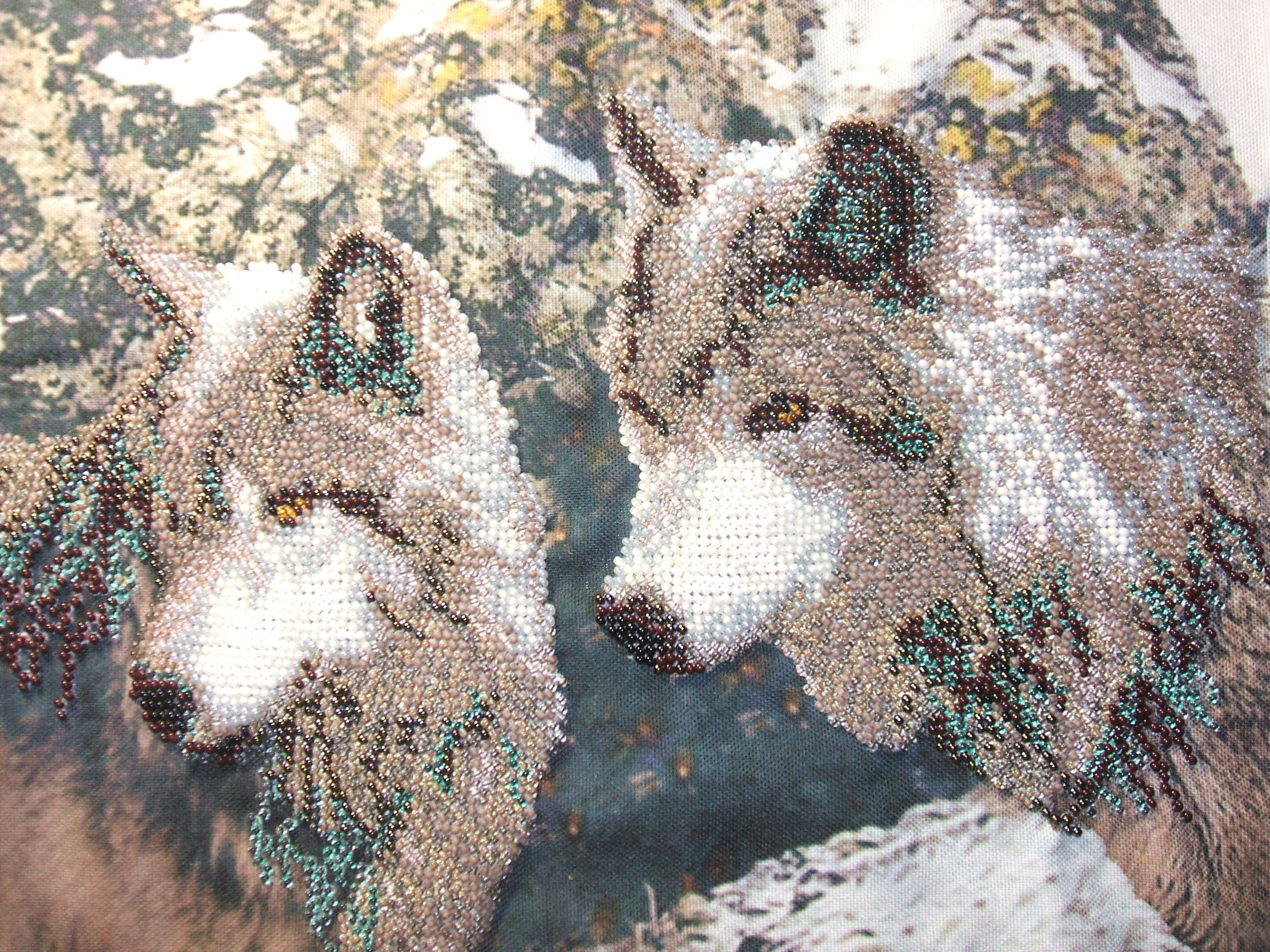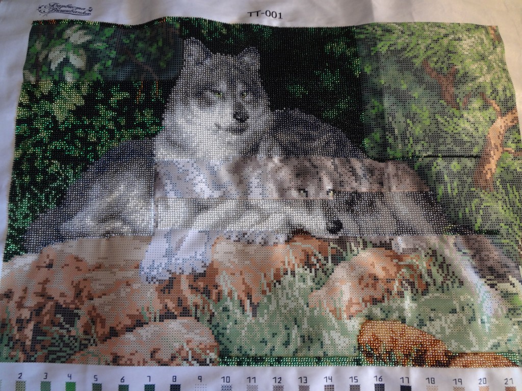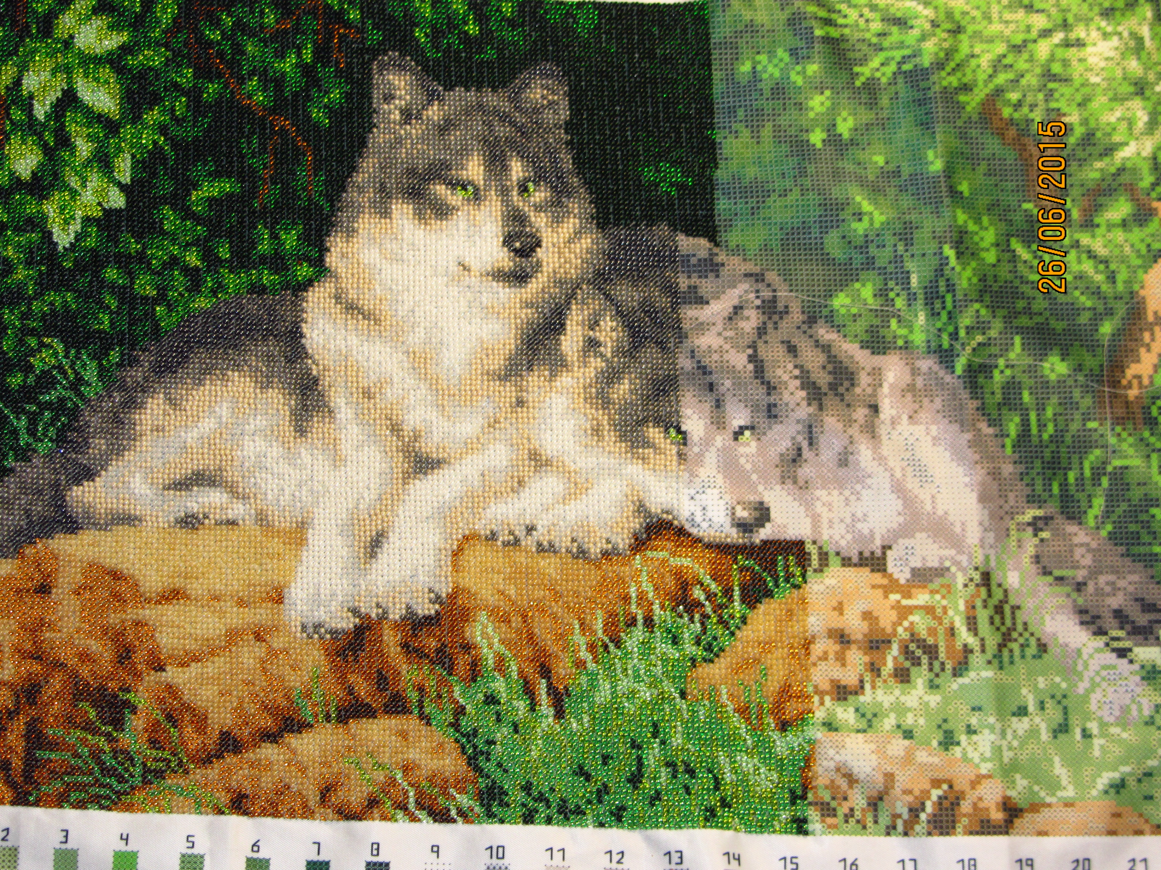Я опять за советом. Не могу определиться с цветовой гаммой для волков. вот фото моей вшивки. 1 вариант волка - это где вышито много, а 2 вариант волка - это полоса внизу. Какой вариант лучше?.jpg)