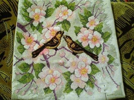 Вот одна из моих работ, на канве, смесь ниток, а птички - бисером