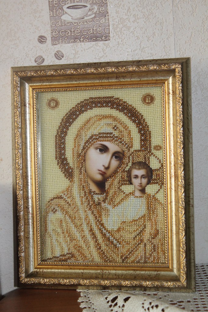 Принимайте и меня сюда) Закончила и сегодня забрала из оформления. Вышивка на атласе, чешский бисер, размер вышивки 16х23 см. Икона Казанской Божьей Матери, делала в подарок на венчание подруги.
