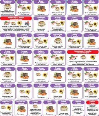 календар на різдвяний піст любого року. Взагалі цей піст не суворий. Основне в харчуванні- це невживання їжі, яка має тваринне походження, іноді можна рибу, та невживання алкоголю