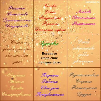 Обычно в середину карты желаний клеят себя любимую)) и уже окружают картинками.
