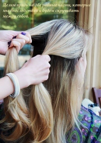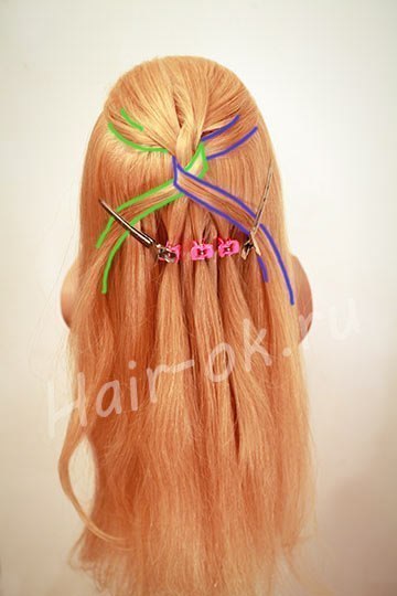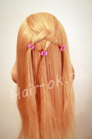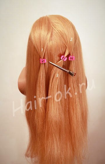 1. Выделите часть волос в нужной Вам области. Разделите эту часть на три пряди и закрепите ленты так, чтобы слева были две пряди, далее две ленты и снова прядь волос.