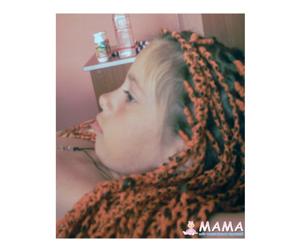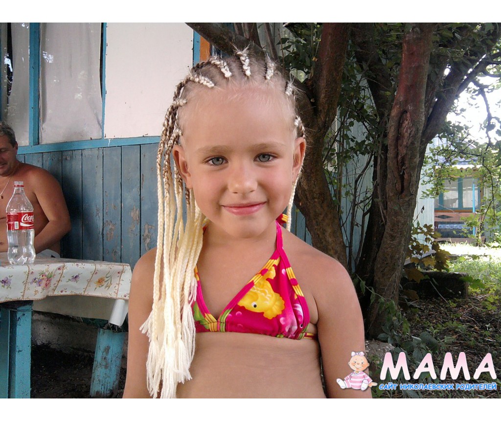 Косички с акриловыми нитками не очень понравились, в воде нитки ослабевали, становились тяжелыми и сползали с корней волос, приходилось каждую косичку подтягивать, а то вид был неаккуратный. На фото где-то после недели с косичками, мы их даже месяц не относили, расплели.
