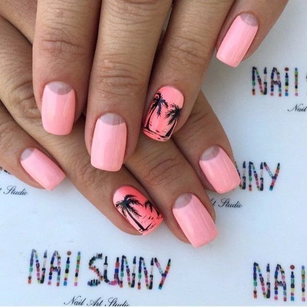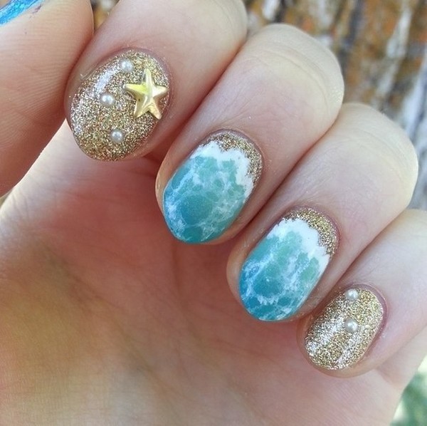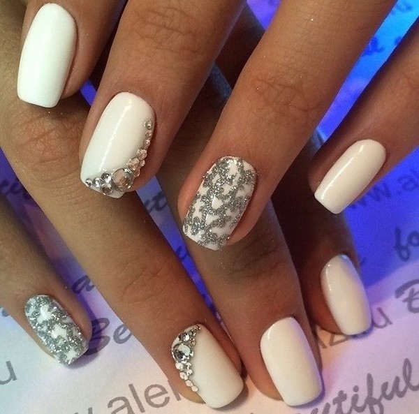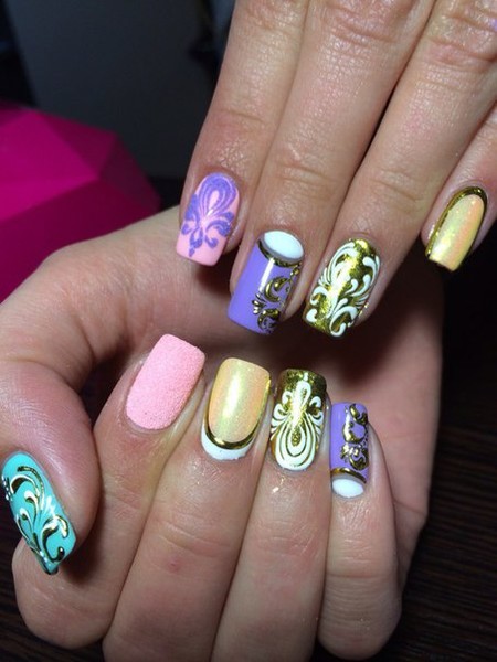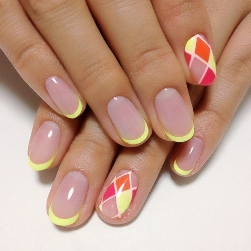 Идеальным вариантом для лета будет Nude маникюр с геометрическим узором или блестками цвета металлика.