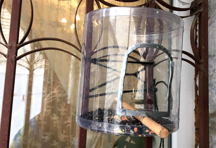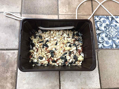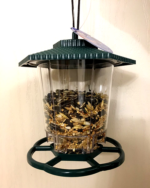 Взяла прозрачную коробку из под елочных игрушек, вырезала отверстие (края обязательно нужно чем то обработать, чтоб птички не ранились), продела жордочку и ..