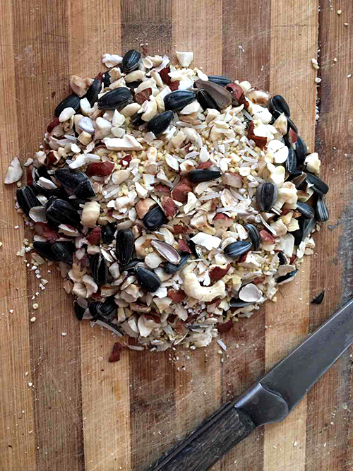 Кормили тем, что было дома: семечки (если крупные лучше немного потолочь, разные зерна, измельченные орежки).