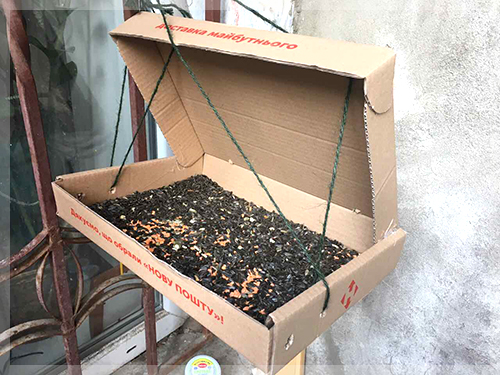 Вот одна из последних кормушек. Для изготовления потребовалась коробка из новой почты и клеевой пистолет (зафиксировала крышку, чтоб не закрывалась)