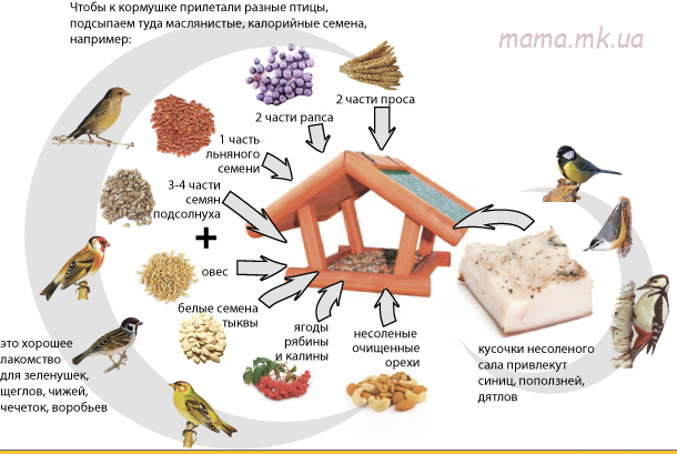 Аннушка, я у тебя в ФБ высмотрела, что можно подкармливать кормом для попугаев, это для меня было открытием. Никогда в голову не приходило. А ведь правда - что лучше для птиц, чем корм для птиц :) А то в картинке наверху упомянули корм для котов, собак и даже рыбок, а про птичий ничего :) Посмотрела - стоит 10-12 грн за полкило.