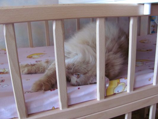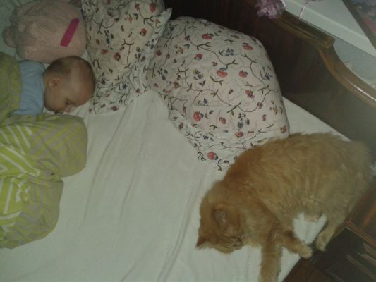 Кошак сразу попробовал выпросить у дочери еду как у взрослых (залезть сверху и потоптаться лапами), но мелкая жеста не оценила и включила сирену. Теперь кот просто дочь игнорит, хотя коляска и кроватка ему очень нравятся. Если малую поднести или положить рядом Перс делает вид, что ее нет. Позавчера мелкая пробовала как-бы ходить - ноги переставлять, при этом на дороге лежал кот. Ему три раза досталось пяткой по лбу - даже морду не отвернул, флегма....