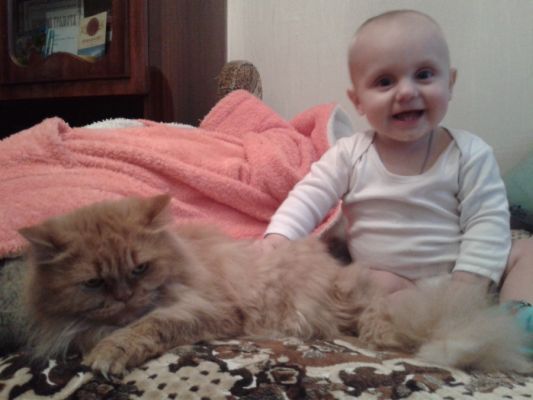 Ой, у моих сложные отношения. Сегодня, например, Дасевич устроил гонки за кошкой.Сначала загнал ее под стул возле вешалки, она еле выбралась. Потом все равно словил. Взял за холку и как половой тряпкой ею елозил туда-сюда. Легла отдохнуть коша на диван, а он подполз, встал, схватил ее за хвост и со всей силы сдернул с дивана.Объясняю, что кошечку можно только гладить - без толку пока( С другой стороны, на месте животинки, я бы шарахалась от малыша, как от пылесоса, а она поддается ему.