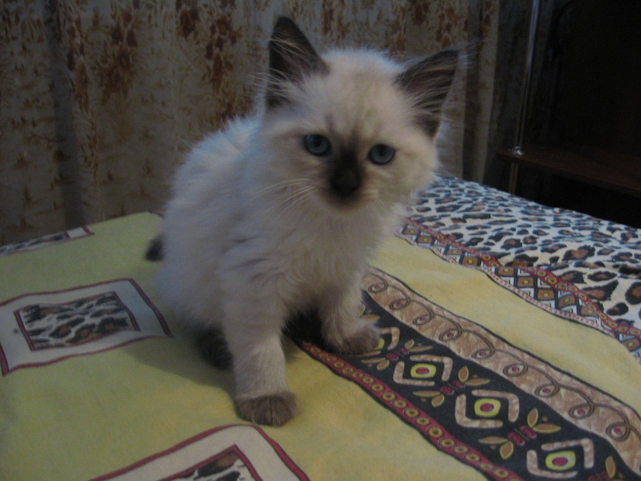 Точно не скажу сколько, т.к. она под диваном за коврами родила. Но видно3 белых а серым пятнышком на голове и один черный.