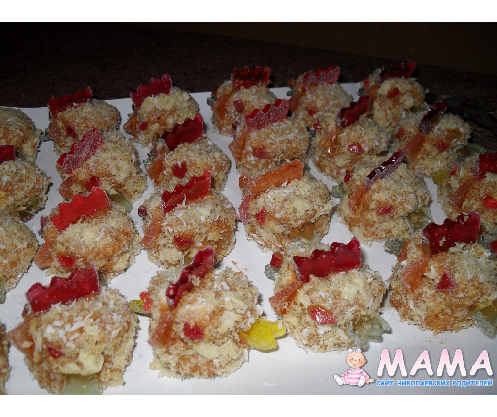 Все хорошо перемешать и разделить на порции, скатать в форме картошки. Обвалять в какао или в кокосовой стружке (кому, что больше нравится). Выставить на холод. Через час можно подавать на стол.