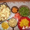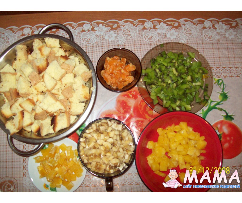 Всё нарезаем кубиками,желе самое последнее режем(Которое заранее уже приготовили и оно застыло хорошо).