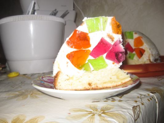 Я тоже делала "Битое стекло", сфоткать не успела... Решила, что в следующий раз буду делать его чисто желейным, без бисквита))