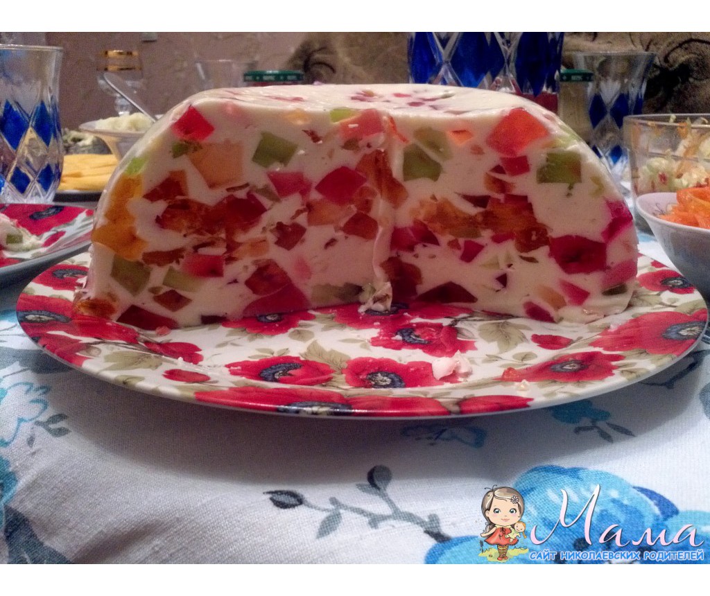 Можно конечно и самим сделать, я брала магазинное желе трёх ярких цветов- вишнёвое, апельсиновое и киви. А вместо крекера я брала бисквитное печение, мне больше нравится. А сверху потёрла шоколадку, потому что мне верх кажется незаконченным))
