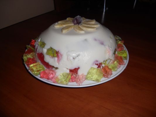 Я фрукты консервированые и размороженные складываю в мисочку и заливаю очень маленьким количеством сиропа с большей концентрацией желатина. Можно потом клубнички отдельно поразрезать и в основу. Но в клубнике мелкие косточки, мне не нравится. Вот половинки персиков, абрикоса - вкуснятина.