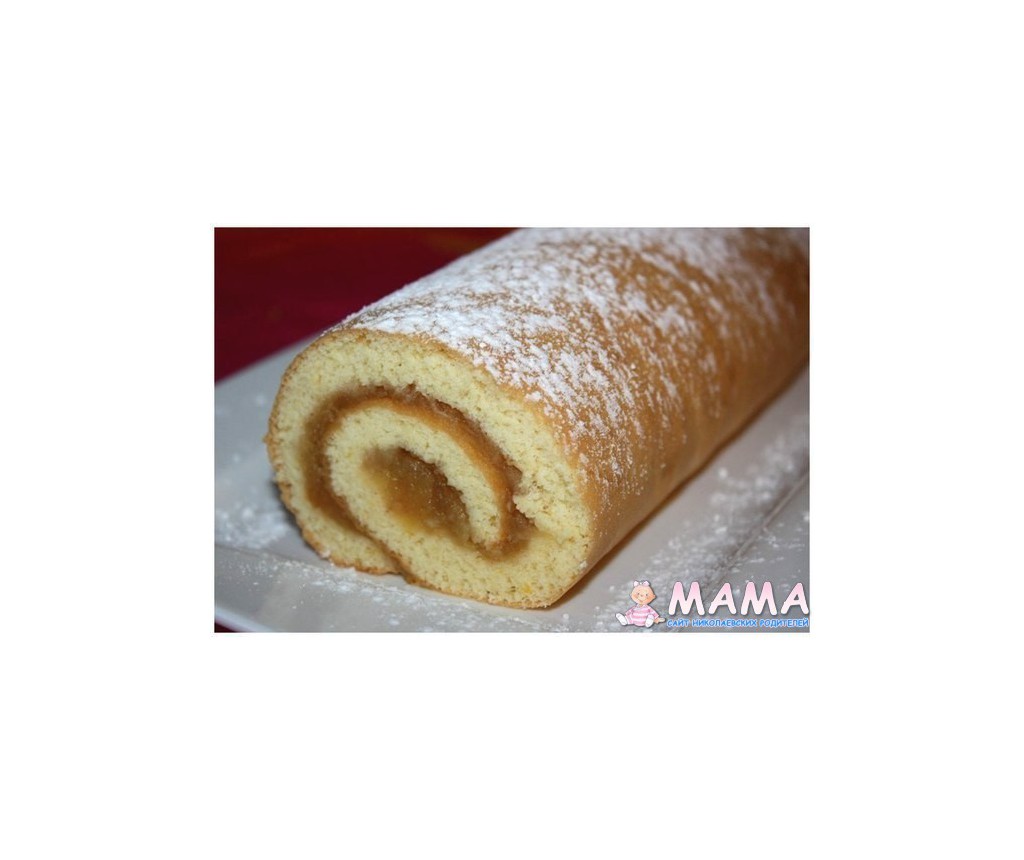 Противень с готовым бисквитом накрыть чистым полотенцем, перевернуть бисквит на полотенце начинкой вверх, снять бумагу и сразу же, при помощи полотенца, завернуть рулетом так, чтоб яблочная начинка оказалась внутри. Слегка посыпать сахарной пудрой.