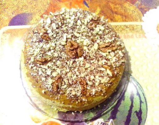 Звичайний бісквіт змастила вареною згущенкою всередині і зверху, і присипала товченими горішками