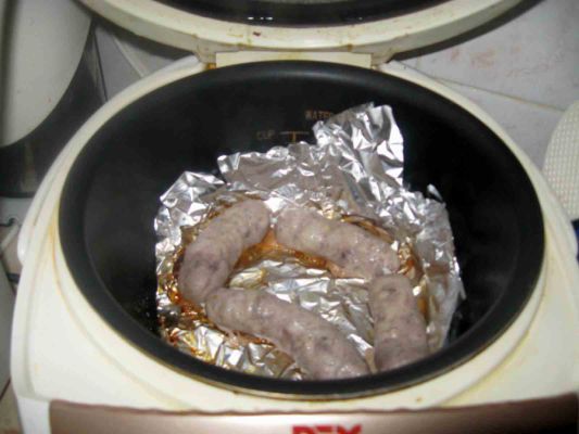колбаски в мультиварке, осталось перевернуть чтобы поджарились в другой стороны - и можно лакомиться :)