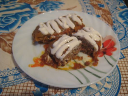 да я лентяйка такая, что рецептами редко пользуюсь. Этот "на глаз" делала. Сделала фарш из свинины 1кг, лук нарезала мелко 3-4шт, специи, соль, перец, пару яиц вбила, 2 небольшие картофелины сырые натерла, сметаны полстакана, водички стакан и муки 3-4 столовые ложки. "Тесто" не крутое должно быть. Потом половину фарша в форму, 5 яиц вкрутую по кругу разложила и остальным фаршем залила. Выпекала где-то час. В общем, такая большая ленивая котлета или мясная зраза вышла) это ф.1, на ф.2 не он, а яблочный пирог)