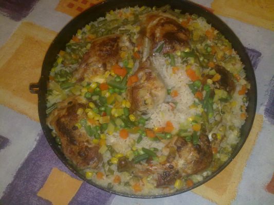 у нас был рис с овощами и курочкой в сметане и икра баклажанная.