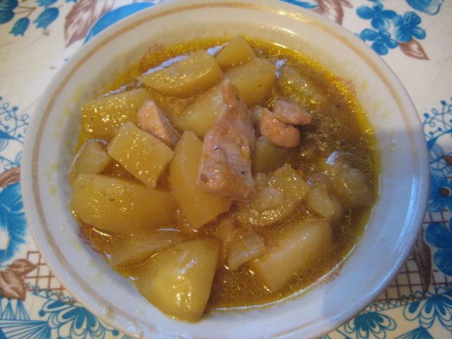 У нас картошка с мясом (типа жаркое) и домашние чебуречки.Сделала по новому рецепту, там тесто заварное и в тесто добавляется водка.Очень вкуснячие