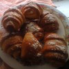 Запеченная курица,пюрешка,рулетики из баклажанов,пончики с сливой.