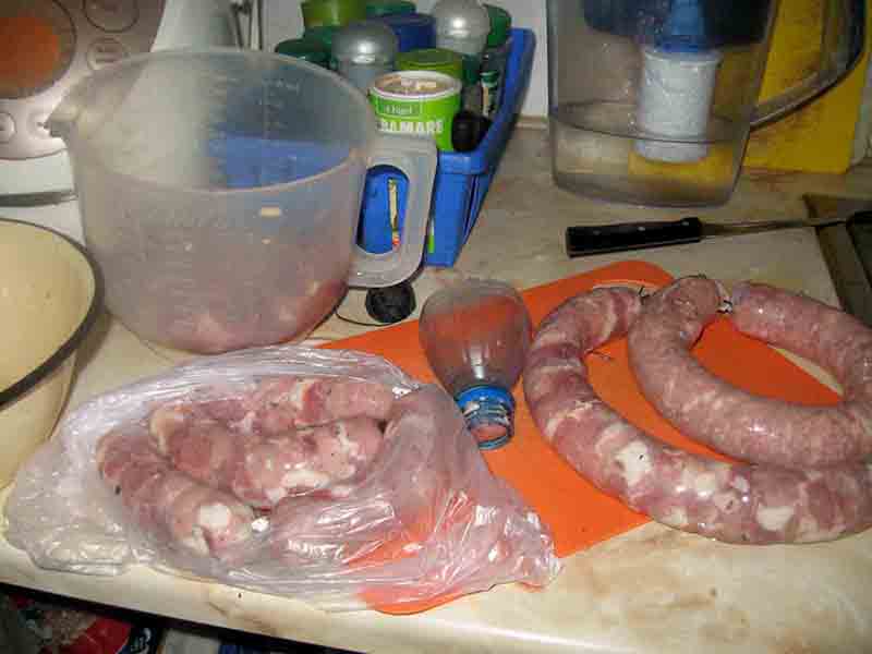 Потом начиняю кишки. у меня нет современного комбайна с насадкой и мясорубки тоже нет, только старенький комбайн. Поэтому я начиняю через срезанное горлышко пластиковой бутылки 0.5 л. Это быстро. По ходу- могу перекручивать и перевязывать ниткой или делать длинный колбаски- это по настроению.