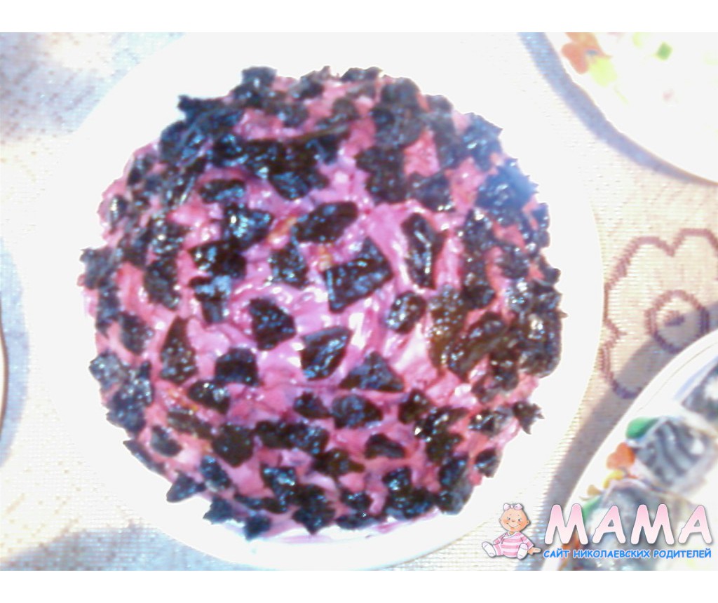 Смазать сверху майонезом и выложить по всей поверхности чернослив(нарезанный маленькими кусочками)