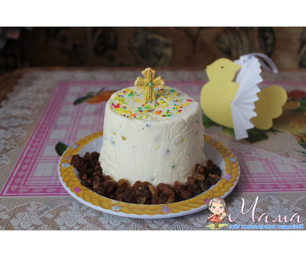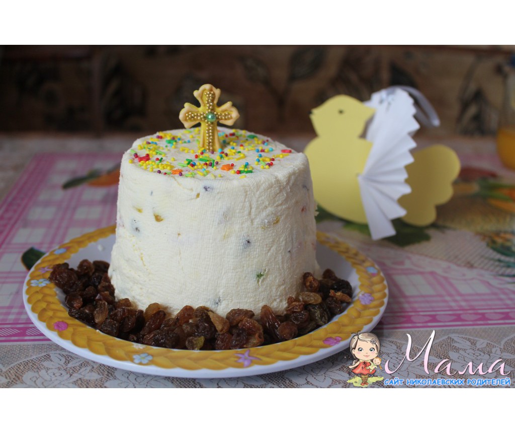 это моя первая в жизни творожная паска. спец.формы у меня не было, заменила ее ведерком от майонеза (внизу сделала гвоздем дырочки,что б сыроватка стекала)