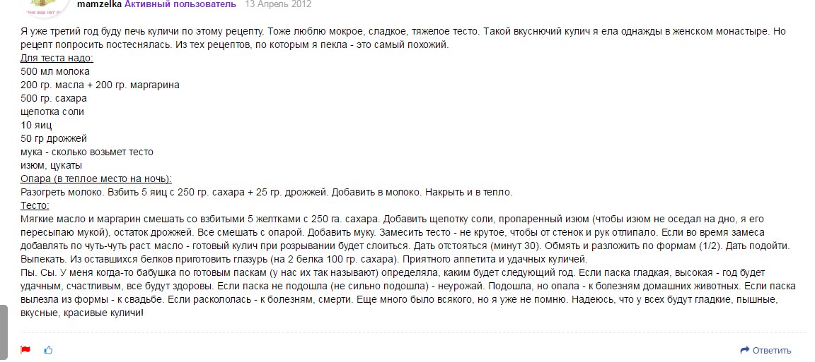 Цитата Ссылка 04 Май 2016 18:47Пекла в этом году по двум рецептам из этой темы: mamzelkИ и Люды (bloodya). Как по мне, то на вкус примерно одинаковые получились,,Мясоедовские чуть слаще, я еще цедру в тесто добавляла. Вкусные, но все же не плотные и влажные, больше воздушное тесто.